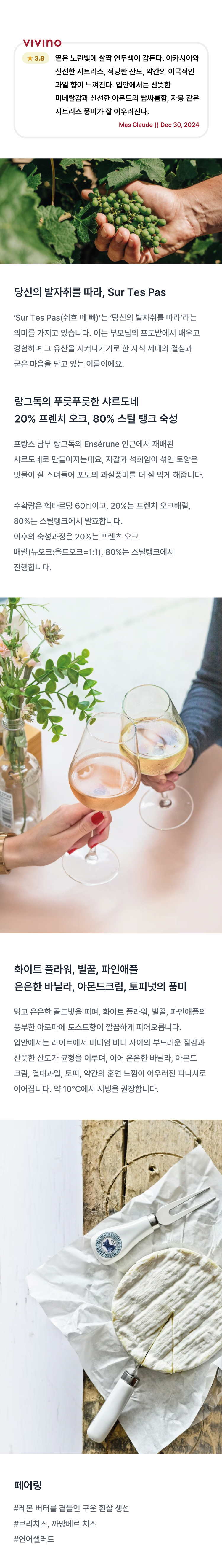 입안에서는 산뜻한 미네랄감과 신선한 아몬드의 쌉싸름함, 자몽 같은 시트러스 풍미가 잘 어우러집니다.