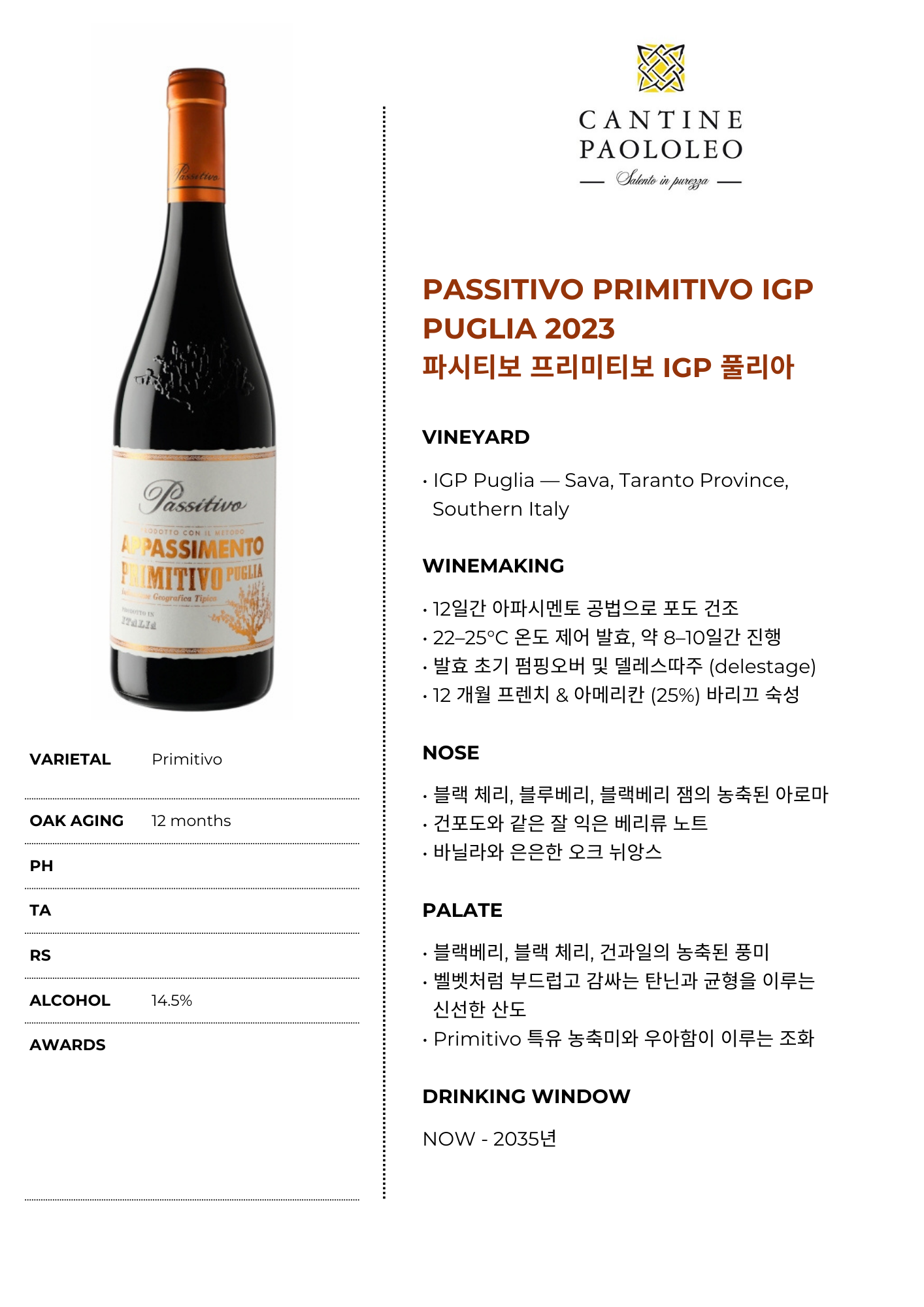 Primitivo 특유의 농축된 과실감과 우아한 구조가 조화를 이루며 길고 풍부한 피니시