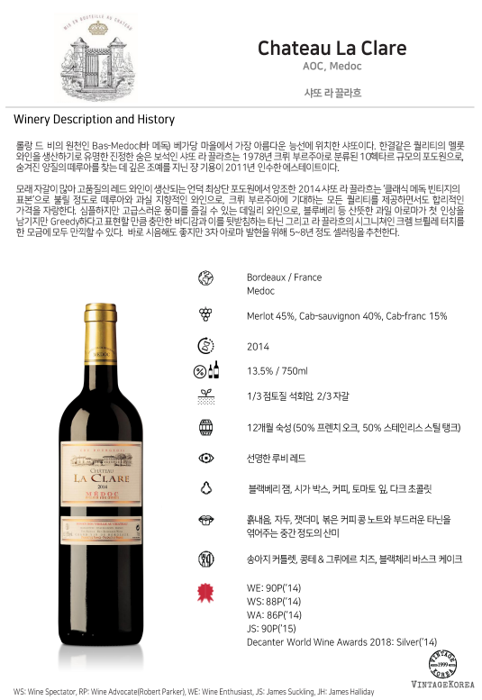 모래 자갈이 많아 고품질의 레드 와인이 생산되는 언덕 최상단 포도원에서 양조한 2014 샤또 라 끌라흐는 ‘클래식 메독 빈티지의 표본’ 으로 불릴 정도로 떼루아와 과실 지향적인 와인으로, 크뤼 부르주아에 기대하는 모든 퀄리티를 제공하면서도 합리적인 가격을 자랑한다. 심플하지만 고급스러운 풍미를 즐길 수 있는 데일리 와인으로, 블루베리 등 산뜻한 과일 아로마가 첫 인상을 남기지만Greedy 하다고 표현할 만큼 충만한 바디감과 이를 뒷받침하는 타닌 그리고 라 끌라흐의 시그니쳐인 크렘 브륄레 터치를 한 모금에 모두 만끽할 수 있다. 바로시음해도좋지만 3차 아로마 발현을 위해 5~8년 정도셀러링을 추천한다.