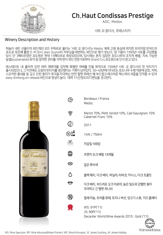 에스테이트 내 흩어져 있던 여러 떼루아를 집약해 특별한 뀌베를 만들 목적으로 1998년 샤또 오 꽁디사의 첫 빈티지가 출시되었으나, 그 이전에도 소량의 빈티지를 생산했다는 기록이 남아있다. 30~40년에 다다르는 포도 나무 수령 덕분에 감초, 커피, 스모키한 흙 내음 등 깊고 진한 풍미가 후각을 자극하는 반면 팔렛 위에선 꽤 부드럽고 매끄러운 텍스쳐의 과즙을 만끽할 수 있어 easy drinking on release 와인으로 명성이 높다. 대략 1시간 정도의 디켄딩을 권고한다.